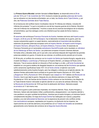 La Primera Guerra Mundial se desarrolló entre 1914 y 1918 e involucró a las principales potencias mundiales alineadas en dos bandos: los Aliados y las Potencias Centrales. Más de 70 millones de militares fueron movilizados y más de 9 millones murieron, muchos debido a los avances tecnológicos. El asesinato del archiduque Francisco Fernando en 1914 llevó a las potencias a invocar alianzas que pronto las pusieron en guerra a través de sus colonias en todo el mundo. Tras cuatro años de combates