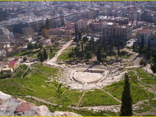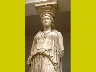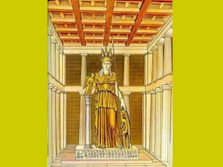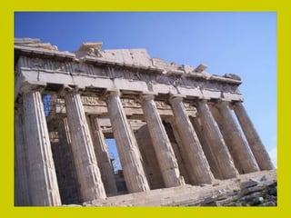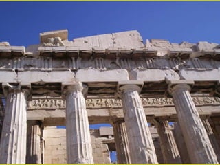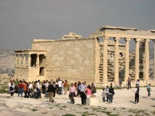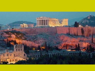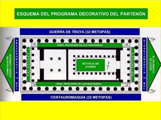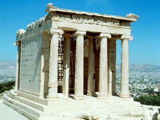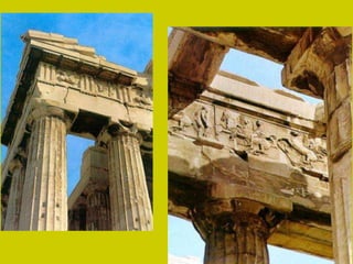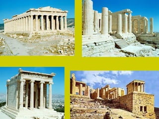 El documento describe los principales monumentos de la Acrópolis de Atenas, incluyendo el Partenón, el Templo de Atenea Niké, el Erecteion y los Propileos. El Partenón se destaca por su armonía y proporción, con un peristilo que rodea el naos y el pronaos. El Erecteion es un templo compuesto dedicado a tres dioses con un pórtico de cariátides notable. El Museo de la Acrópolis de Atenas alberga piezas de estos templos.