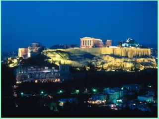 El documento describe la Acrópolis de Atenas, el conjunto monumental más representativo del arte griego del siglo V a.C. Incluye los principales edificios como el Partenón, Erecteión, Propíleos y el Templo de Atenea Niké, reconstruidos durante el gobierno de Pericles. Los Propíleos fueron las puertas monumentales de acceso diseñadas por Mnesicles en 437 a.C., mientras que el Templo de Atenea Niké conmemoraba la victoria griega sobre los persas a través de sus altor