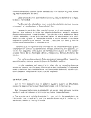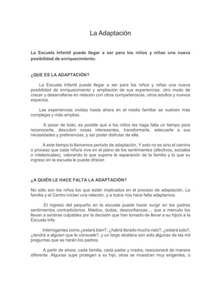 La adaptación a la escuela infantil es un proceso que requiere tiempo tanto para los niños como para sus familias y educadores. Implica un periodo de ajuste a la nueva situación de separación de la familia y la integración en el nuevo entorno escolar, con sentimientos como miedo, duda o alegría. Es importante que padres, educadores y el centro colaboren para facilitar la adaptación de cada niño de forma flexible y respetuosa.