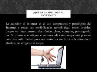 La adicción al internet se manifiesta como un uso compulsivo que provoca descuido en la salud física y mental, aislamiento social y problemas en diversas áreas de la vida. Por otro lado, la piratería informática involucra la reproducción y distribución ilegal de software, siendo tanto deliberada como no, y afecta al mercado al fomentar prácticas ilegales. Las causas de ambas problemáticas incluyen factores como la necesidad de conexión continua y la demanda de contenido sin costo.