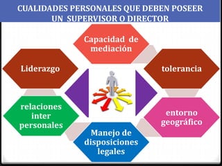 El documento describe las cualidades y responsabilidades clave de un supervisor o director escolar. Un supervisor debe poseer capacidades de liderazgo, mediación y tolerancia, así como manejar disposiciones legales y garantizar el aprendizaje de los estudiantes. También debe fortalecer la escuela mediante la capacitación de profesores, la incorporación de padres, reuniones con la comunidad y diálogo con el profesorado.