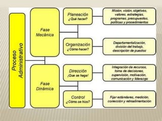 Este documento describe los fundamentos y la importancia de la administración. Define la administración como un proceso que consiste en la distribución y asignación de recursos para alcanzar los objetivos de manera eficiente a través de las actividades de planeación, organización, dirección y control. Explica que la tarea principal de un administrador es fijar objetivos y administrar los recursos humanos, materiales y financieros para lograr los resultados deseados de forma rentable. Finalmente, destaca algunas claves para administrar eficientemente una empresa como definir objetivos claros y