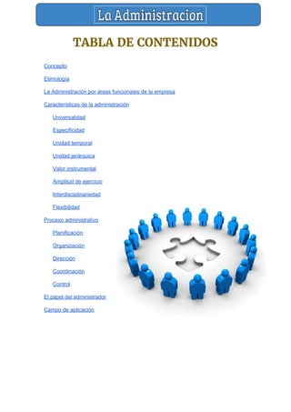Este documento define la administración como la ciencia y técnica de planificar, organizar, dirigir y controlar los recursos de una organización para lograr sus objetivos de manera eficiente. Explica que la administración se aplica a empresas, instituciones públicas y privadas, y describe sus características como la universalidad, especificidad, unidad temporal y jerárquica, valor instrumental y flexibilidad. Finalmente, resume el proceso administrativo como la planificación, organización, dirección, coordinación y control de una organización.