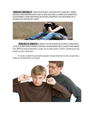 La adolescencia se define como el período entre los 10-12 años hasta los 19-20 años, en el que se producen cambios psicológicos, biológicos y sociales. Los principales problemas que suelen presentarse son emocionales como la tristeza y la depresión, de conducta como el conflicto con los padres, escolares como la falta de inclusión, sexuales como embarazos no deseados, y por el uso de alcohol y drogas.