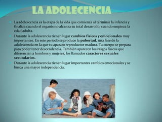 La adolescencia es la etapa entre la infancia y la adultez que se caracteriza por cambios físicos y emocionales importantes como la pubertad y la búsqueda de independencia. Durante este periodo, los adolescentes experimentan inestabilidad emocional y crisis en el desarrollo de su personalidad mientras navegan factores de riesgo como problemas familiares o de conducta y tratan de establecer su identidad.