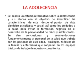 Este documento resume las características de la adolescencia desde las perspectivas biológica, psicológica y social. Identifica las etapas de la adolescencia y los cuidados necesarios para evitar resultados negativos en el desarrollo de la personalidad. Enfatiza el importante papel de la familia en brindar apoyo y orientación a los adolescentes durante este período de transición.