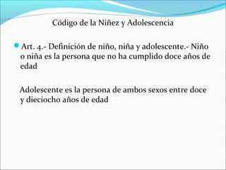 Este documento trata sobre la adolescencia y el embarazo en la adolescencia. Define la adolescencia como el período entre los 10 a 20 años según la OMS, cuando la persona adquiere la capacidad reproductiva y transita de la niñez a la adultez. Explica que en Ecuador 2 de cada 10 chicas entre 12-14 años inician relaciones sexuales y que 7 de cada 10 chicas que dan a luz dejan los estudios. Finalmente, presenta datos sobre el tamizaje del VIH en embarazadas entre 10-14 años en el país.