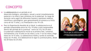 La adolescencia es el período entre los 10-19 años caracterizado por cambios biológicos, psicológicos y sociales. Biológicamente, los adolescentes experimentan cambios relacionados a la pubertad como el desarrollo de los órganos sexuales, la menstruación en mujeres, y la producción de esperma en hombres. Psicológicamente, los adolescentes desarrollan su identidad e independencia mientras navegan nuevas relaciones sociales.