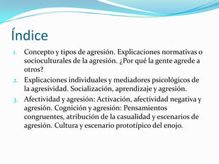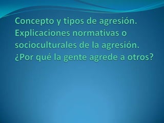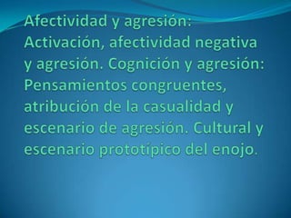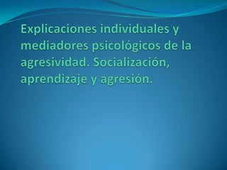 La agresión puede ser el resultado de factores innatos o aprendidos. La teoría del aprendizaje social explica que los niños aprenden conductas agresivas a través de la imitación de modelos agresivos y el refuerzo. Factores como la afectividad negativa, el estrés, la frustración y el contexto sociocultural también influyen en la probabilidad de comportamiento agresivo. La familia y la escuela son entornos clave que moldean la agresividad en la infancia a través de la interacción, disciplina y modelos de conduct