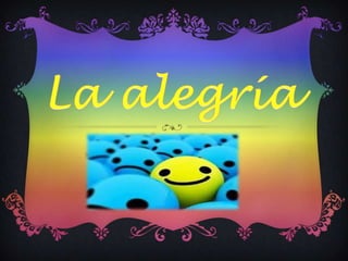 Este documento describe la alegría como una disposición positiva al optimismo que ayuda a disfrutar de las personas y situaciones. Explica que la alegría verdadera proviene de una experiencia interior profunda, mientras que la alegría falsa es superficial y puede desaparecer fácilmente. También recomienda manifestar la alegría de forma respetuosa para mejorar las relaciones con los demás.