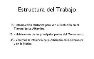 La Alhambra es un conjunto palaciego y fortificado situado en Granada, Andalucía. Comenzó como una fortaleza militar en el siglo XIII y fue ampliada y transformada en palacio real por los sultanes nazaríes entre los siglos XIII y XV. Está dividida en varias secciones principales como la Alcazaba, los Palacios Nazaríes, el Generalife y los jardines del Partal. La Alhambra ha influido en la literatura, como en los Cuentos de la Alhambra de Washington Irving, y en la