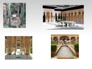 La Alhambra de Granada es un rico complejo palaciego y fortaleza que alojaba al monarca y corte del Reino nazarí de Granada. Consta de varias partes importantes como la alcázaba, los Palacios Nazaríes y el Patio de los Leones. Su arquitectura se caracteriza por el uso de columnas finas, ricas decoraciones de cerámica y yesería con caligrafía y poemas.