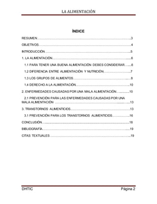 Este documento trata sobre la alimentación y su importancia para la salud. Explica que la alimentación adecuada proporciona las necesidades nutricionales específicas de cada persona y permite gozar de bienestar biológico, psicológico y social. Sin embargo, una mala alimentación puede causar enfermedades y trastornos alimenticios. Describe los principales grupos de alimentos y la diferencia entre alimentación y nutrición. Resalta que todos tienen derecho a una alimentación adecuada y que una dieta