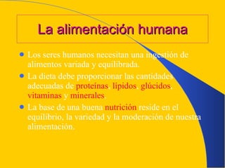 Los seres humanos necesitan una dieta variada y equilibrada que proporcione proteínas, lípidos, glúcidos, vitaminas y minerales. Una buena nutrición se basa en el equilibrio, la variedad y la moderación de los alimentos. Sin embargo, la alimentación a menudo es desequilibrada y en algunos países hay personas que sufren desnutrición debido a la falta de ingesta de alimentos o a estados de exceso de gasto metabólico. Hoy en día, el riesgo de desnutrición afecta a todos los