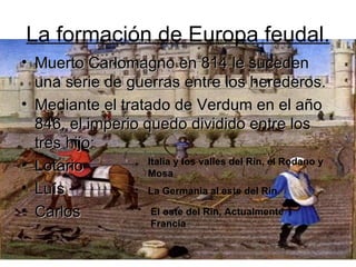 Tras la muerte de Carlomagno en 814, el imperio carolingio se dividió entre sus tres hijos mediante el tratado de Verdum de 846. Esto condujo a la desintegración del poder real y el aumento del poder de los condes locales. En este contexto surgieron las invasiones normandas, eslavas y mongolas, y los señores feudales tuvieron que defender sus territorios de forma independiente, dando lugar al sistema feudal, con el feudalismo como unidad básica y el vínculo de vasallaje entre señores y vasallos.