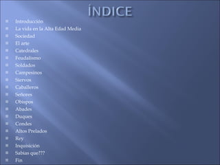 El documento resume aspectos clave de la sociedad y la vida durante la Alta Edad Media en Europa, incluyendo la estructura feudal, los roles de campesinos, siervos, caballeros, señores feudales, obispos, duques, condes y el rey. También describe algunas de las catedrales más famosas de la época y menciona la influencia de la Iglesia católica, incluyendo la Inquisición.