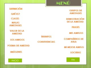 La amistad es una de las relaciones interpersonales más comunes y se puede formar en cualquier etapa de la vida. Implica compartir intereses comunes y ofrecer apoyo emocional mutuo a través de lealtad y confidencialidad. La verdadera amistad dura toda la vida.