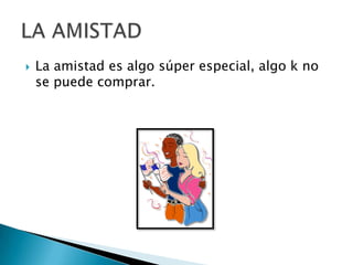 La amistad es algo valioso que no se puede comprar y que implica apoyarse mutuamente en las buenas y malas, escucharse sin juzgar, y nunca hablar mal del otro a sus espaldas. Una buena amistad se caracteriza por la confianza, honestidad y compromiso de estar presente el uno para el otro sin importar las discusiones pasajeras.