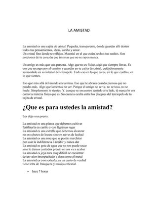 El documento describe la amistad como un cristal fino donde se guardan los pensamientos y sentimientos más profundos. Un amigo es algo intangible que se lleva dentro y se siente aunque no se vea físicamente. La poesía compara la amistad a una planta que requiere cuidados como el cariño y las lágrimas para cultivarse, una estrella que se alcanza con lealtad en lugar de locura, y una joya rara y valiosa.