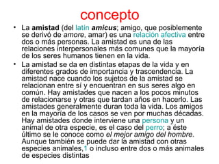 La amistad es una relación afectiva entre dos o más personas que comparten confianza, empatía, simpatía y fidelidad. Los principales componentes de la amistad son el amor, la confianza, la sinceridad y el interés y preocupación por el bienestar del otro. Las amistades generalmente duran toda la vida y se basan en la reciprocidad de apoyo mutuo en los buenos y malos momentos.