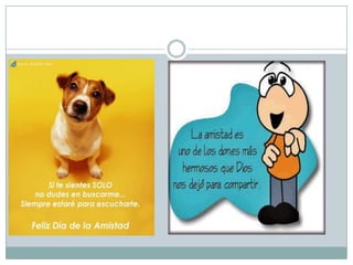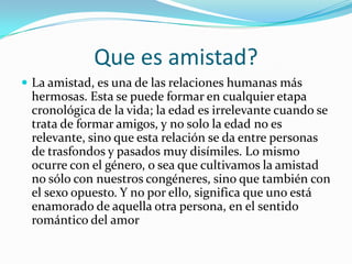 El documento habla sobre la amistad. Define la amistad como una de las relaciones humanas más hermosas que puede formarse sin importar la edad, género u orígenes. Explica que los amigos verdaderos son aquellos que demuestran su amistad con hechos y no solo con palabras. Finalmente, señala que la amistad es más difícil de mantener que el amor romántico y por eso hay que esforzarse por preservarla.