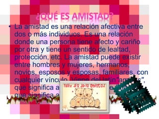 La amistad es una relación afectiva entre dos o más personas basada en el afecto, la lealtad y la protección mutua. Puede surgir de diversas fuentes como la escuela o el trabajo, y aunque no se requiere que los amigos sean iguales, la amistad funciona complementando a cada persona. En muchas culturas se celebra un Día de la Amistad para honrar esta importante relación.