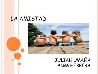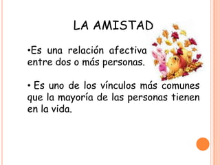 La amistad es una relación afectiva entre dos o más personas que se basa en intereses y valores compartidos. Es uno de los vínculos más importantes en la vida y puede durar desde minutos hasta toda la vida. Los filósofos griegos consideraban la amistad como una gran virtud que simboliza un regalo de los dioses.