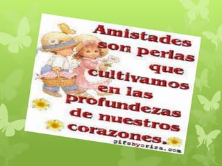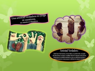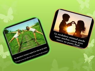 La amistad es una relación afectiva entre individuos caracterizada por valores como la lealtad, la solidaridad y el amor. Una verdadera amistad no se define por la inseparabilidad física, sino por mantener los mismos sentimientos de afecto aunque las personas estén separadas.