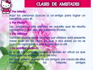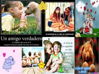 La amistad es una de las relaciones interpersonales más comunes y se da entre dos o más personas que comparten inquietudes e intereses. Es una relación afectiva que se desarrolla a lo largo de la vida en distintos grados de importancia según la etapa vital de cada persona.