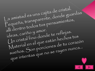 El documento describe la amistad como un tesoro frágil y precioso que se guarda en el corazón. La amistad verdadera es un apoyo incondicional que se demuestra en los momentos difíciles y que dura para siempre.