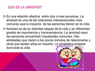 Este documento define la amistad como una relación afectiva entre dos o más personas basada en inquietudes comunes. Explora las perspectivas de la amistad según las religiones, la sociedad y la psicología. Según la religión cristiana, Jesús mostró que la amistad es fundamental para el trato con los demás. Desde una perspectiva sociológica, la amistad requiere reciprocidad, conocimiento mutuo y buscar el bien del otro. Sin embargo, la sociedad moderna a veces descuida la amistad debido al énfasis