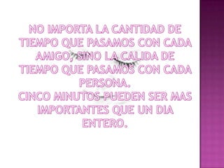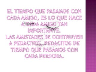 El documento describe las diferentes formas en que se construyen las amistades y lo que las hace importantes. Explica que las amistades se forman a través de pequeños momentos compartidos de calidad más que la cantidad de tiempo pasado juntos. También discute que las amistades pueden formarse de diversas maneras como a través de risas, dolores compartidos, la escuela, el cine o simplemente a través de una simpatía mutua.