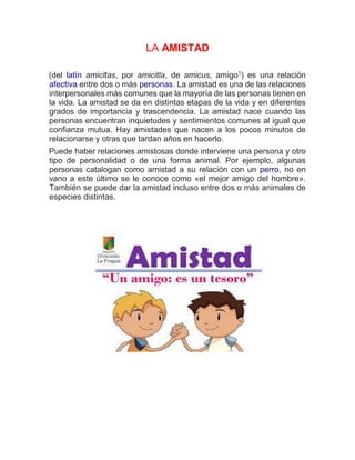 La amistad es una relación afectiva entre dos o más personas que se da en distintas etapas de la vida. La amistad nace cuando las personas encuentran inquietudes y sentimientos comunes al igual que confianza mutua. Además de entre personas, también se puede dar la amistad entre personas y animales, o incluso entre dos o más animales de especies distintas.