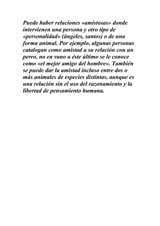 La amistad es una relación afectiva entre dos o más personas que surge cuando encuentran inquietudes comunes y puede durar toda la vida. La amistad se da en diferentes etapas de la vida y grados de importancia. Aunque principalmente es una relación entre humanos, también puede existir entre personas y animales o entre animales de diferentes especies.