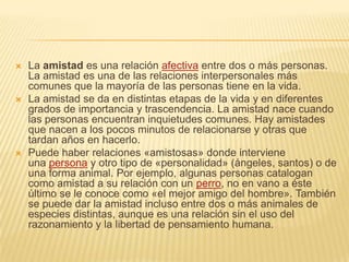 La amistad es una relación afectiva común entre dos o más personas que se desarrolla al encontrar inquietudes en común. La amistad puede darse en diferentes etapas de la vida y grados de importancia, ya sea de forma rápida o después de años de conocerse. Además, algunas personas consideran tener amistad con animales o entes espirituales a pesar de la falta de razonamiento humano.