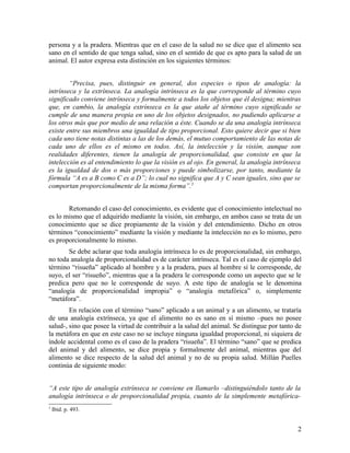El documento explica los conceptos de analogía unívoca, equívoca y análoga. Define la analogía intrínseca como aquella donde el significado del término se aplica formalmente a los objetos, y la analogía extrínseca como aquella donde el significado se aplica a uno de los objetos pero a los otros por medio de una relación. El término "ente" no es ni unívoco ni equívoco, sino análogo intrínseco, pues aunque los entes existen de modos diferentes, todos comparten el hecho de existir.