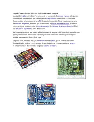 La placa base es una tarjeta de circuito impreso fundamental para armar una computadora. Contiene circuitos integrados que conectan el microprocesador, memoria RAM, ranuras de expansión y otros dispositivos. Va instalada dentro de un gabinete con conectores externos e internos. Incluye un firmware BIOS que permite realizar funciones básicas como pruebas de dispositivos, video, teclado y carga del sistema operativo.
