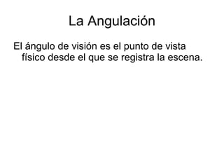 El documento describe diferentes tipos de ángulos de cámara, incluyendo el ángulo normal o medio donde la cámara está a la altura de los ojos, el contrapicado donde se mira hacia arriba, el cenital que ofrece una vista desde arriba, y el ángulo imposible que se logra a través de efectos especiales.