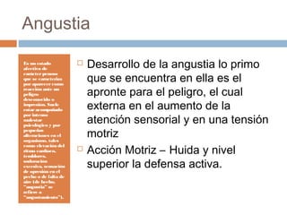La angustia es un estado afectivo penoso que surge como reacción ante un peligro desconocido e incita al cuerpo a prepararse para la acción o la huida. Se caracteriza por aumentos en la frecuencia cardíaca, temblores y sudoración. La angustia está conectada con los destinos de la libido y el sistema inconsciente, y puede manifestarse como angustia expectante, libremente flotante o unida a fobias, dependiendo de los procesos de la libido sexual.
