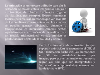 El documento describe varias técnicas de animación como los dibujos animados, la animación stop motion utilizando objetos y figuras, la pixilación y rotoscopía usando personas y objetos reales, y la animación de recortes usando figuras recortadas. Explica que la animación da la sensación de movimiento a imágenes mediante cambios repetidos y que su concepción suele ser un trabajo intensivo normalmente realizado por compañías de animación.