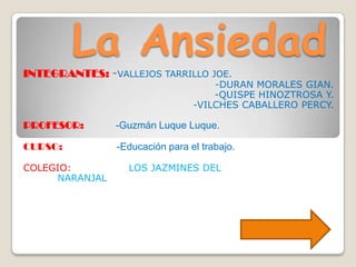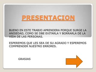 Este documento habla sobre la ansiedad, definiéndola, describiendo sus síntomas, tratamientos y pronóstico. Explica que la ansiedad es una respuesta emocional que incluye aspectos subjetivos, fisiológicos y de comportamiento. Describe los síntomas físicos, cognitivos y de conducta de la ansiedad, así como tratamientos como medicamentos, terapia cognitivo-conductual, ejercicio y cambios en la alimentación. Finalmente, indica que la ansiedad es de por vida pero que muchos pacientes responden bien a