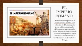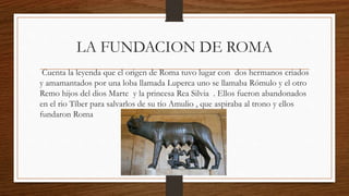 Roma se fundó en las orillas del río Tiber por los hermanos Rómulo y Remo según la leyenda. Pasó de ser una monarquía a una república y luego a un imperio gobernado por un emperador. El Imperio Romano llegó a dominar gran parte de Europa, el norte de África y Oriente Medio, pero finalmente cayó ante las invasiones de los pueblos germánicos en el siglo V d.C.