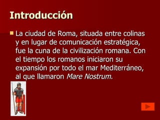Introducción La ciudadde Roma, situada entre colinas y en lugar de comunicación estratégica, fue la cuna de la civilización romana. Con el tiempo los romanos iniciaron su expansión por todo el mar Mediterráneo, al que llamaron Mare Nostrum .