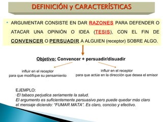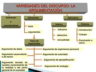 Este documento describe los diferentes tipos y estructuras de la argumentación. Explica que la argumentación consiste en dar razones para defender una tesis con el objetivo de convencer al receptor. Luego detalla las dos estructuras básicas de la argumentación (inductiva y deductiva), los diferentes tipos de argumentos (lógico-racionales y emotivo-afectivos), y las falacias o errores que se pueden cometer al argumentar. Finalmente, menciona algunos géneros discursivos donde se manifiesta la argumentación como los artículos de op