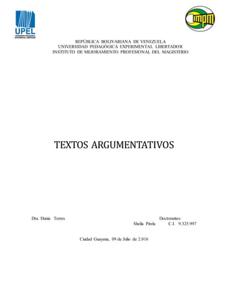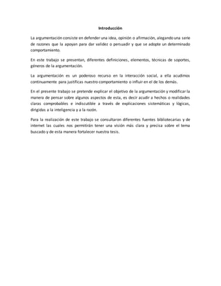 Este documento presenta una introducción a la argumentación, definiendo la argumentación como defender una idea u opinión alegando razones que la apoyan con el objetivo de persuadir. Luego describe diferentes tipos de argumentación, elementos de los textos argumentativos como la tesis y los argumentos, y técnicas de la argumentación como la comparación y el recurso a la autoridad. Finalmente, concluye enfatizando que la fuerza persuasiva de un argumento depende de su consistencia y del grado de aceptación de sus premisas.