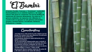El documento resume las características y usos del bambú como material de construcción. El bambú crece rápidamente, almacena carbono, y tiene una buena relación entre resistencia y elasticidad. Se utiliza comúnmente en Asia y América del Sur. Arquitectos innovadores han diseñado varios proyectos notables usando bambú, incluyendo cafés, puentes, casas y proyectos de desarrollo social. El bambú ofrece una alternativa ecológica y sostenible a otros materiales de construcción.