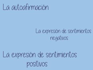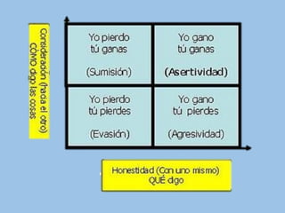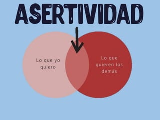 La capacidad de expresar opiniones y sentimientos propios sin ansiedad excesiva y respetando los derechos de los demás, mediante técnicas como la autorevelación objetiva, hacer preguntas o comunicarse de forma no agresiva.
