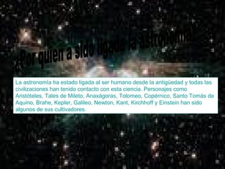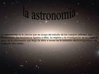 La astronomía es la ciencia que estudia los cuerpos celestes y sus movimientos. Ha estado ligada al ser humano desde la antigüedad. En 2009 se declaró el Año Internacional de la Astronomía para conmemorar descubrimientos de Galileo y Kepler y promover la importancia de esta ciencia. La astronomía argentina se practica oficialmente desde 1871 con el Observatorio Astronómico Nacional en Córdoba.
