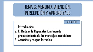 Este documento presenta el Modelo de Capacidad Limitada de procesamiento de mensajes mediáticos. Según este modelo, nuestra capacidad cognitiva para procesar información es limitada, por lo que la atención es selectiva. Para que la comunicación sea efectiva, un mensaje mediático debe atraer la atención a través de rasgos formales como la edición y la producción para ser codificado, almacenado y recordado.
